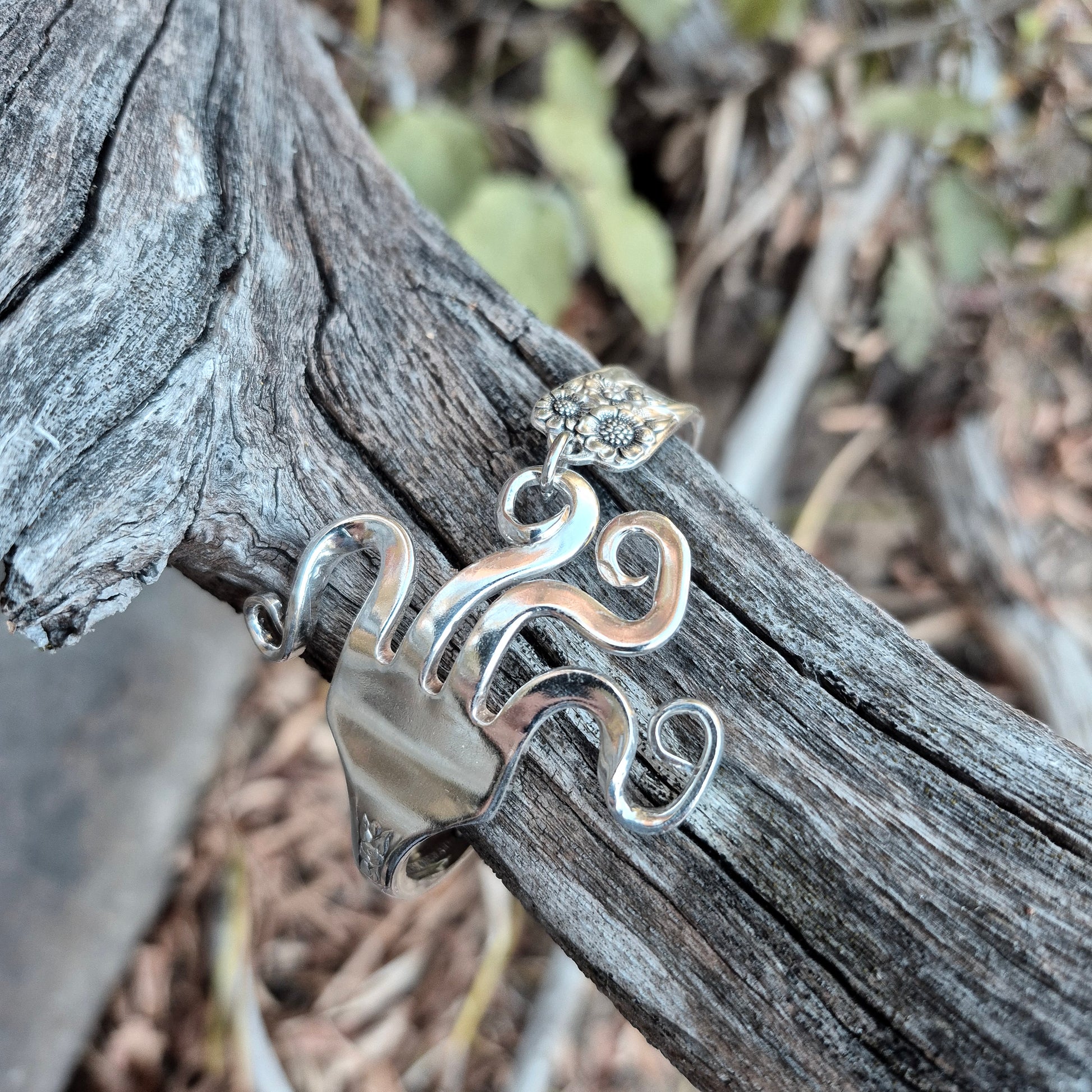 Ce bracelet est conçu à partir d'une fourchette. Chaque bracelet est unique car je donne corps aux dents de la fourchette selon la capacité de celle-ci à se plier à ma créativité.