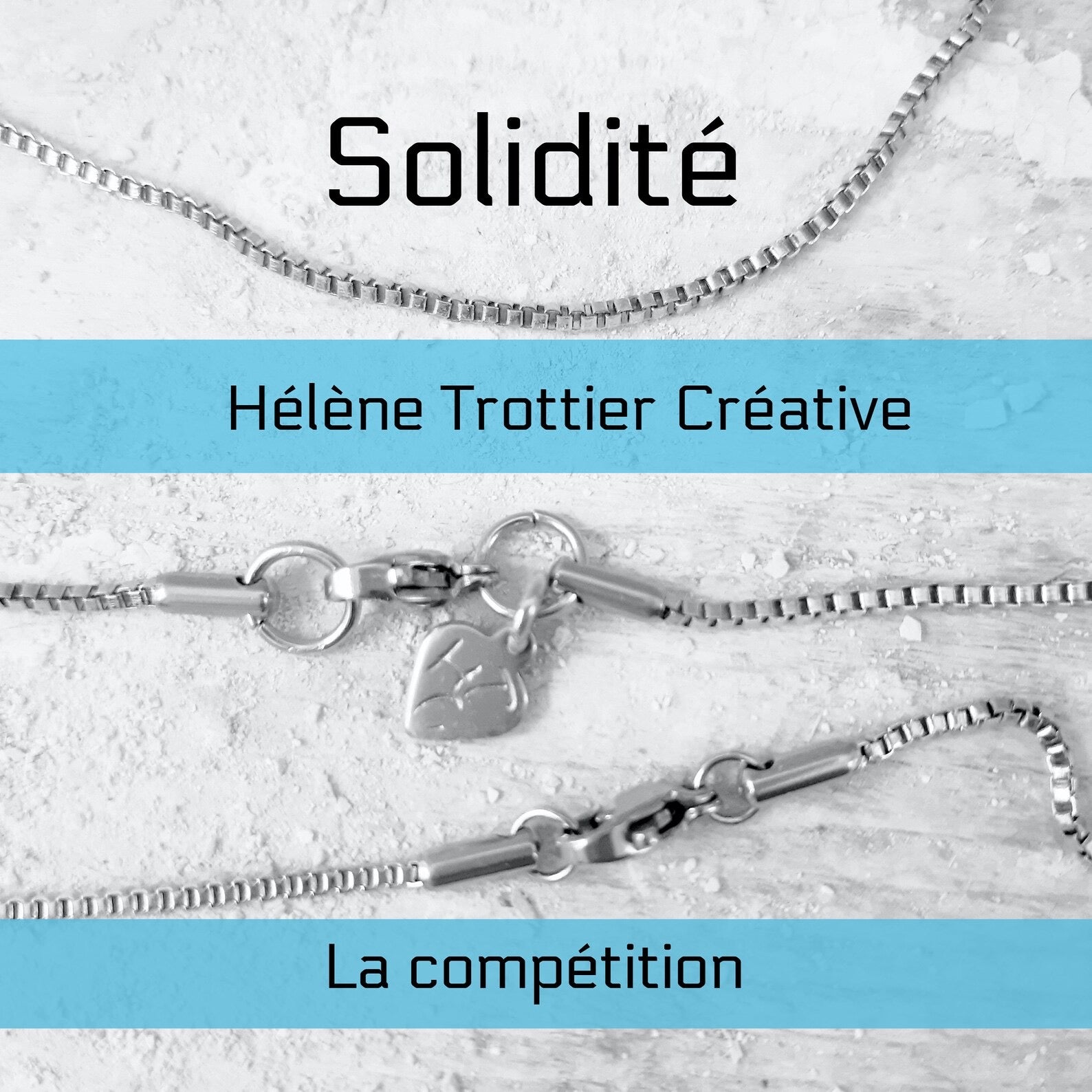 Les anneaux, fermoirs, chaînes sont en acier inoxydable chirurgical.