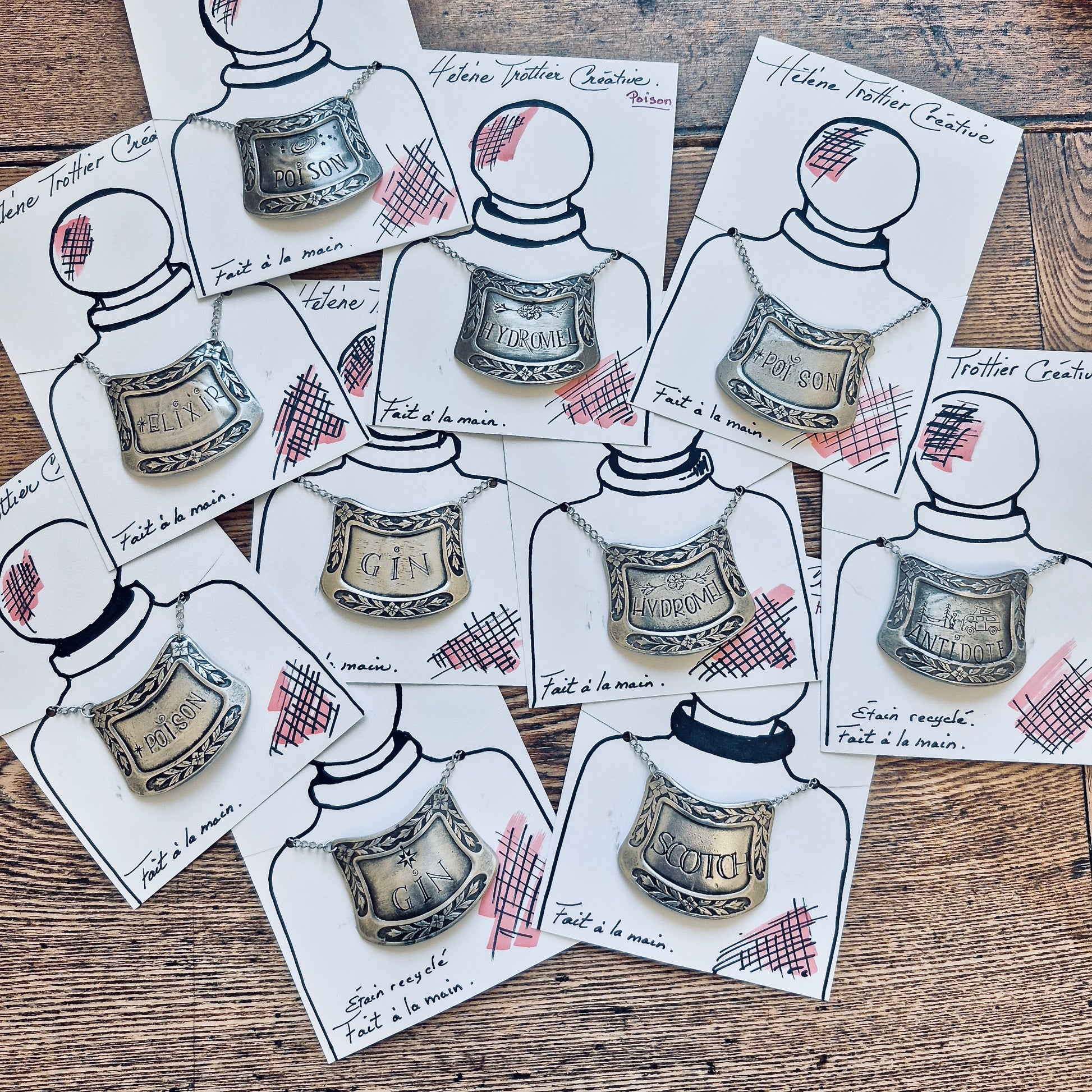 Ils sont créés à la main, avec de l'Étain recyclé. Le métal est fondu dans mon atelier et ensuite pressé sur de vieilles matrices centenaires selon une méthode ancestrale. Il y a tout un travail manuel derrière chaque pièce. Ils sont donc TOUS différents. Egalement je rends au goût du jour ce produit fort populaire au début du siècle dernier.