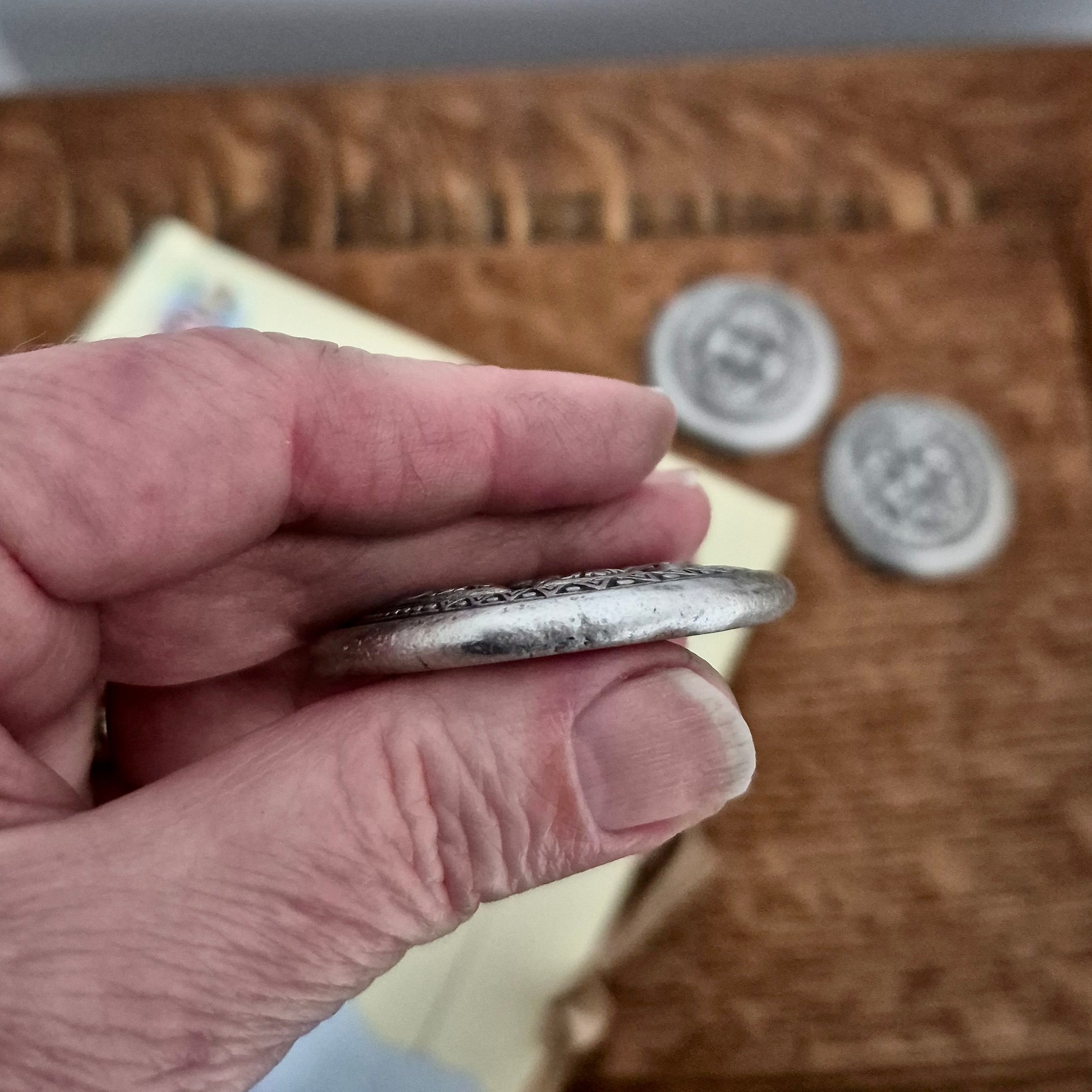 Chaque pièce est faite à la main. Le métal est récupéré et fondu dans mon atelier. Ensuite j'utilise des matrices centenaires et de façon traditionnelle et ancestrale je presse mon galet d'étain avec une force allant jusqu'a 40,000 lbs. Ça ajoute une singularité à la pièce car chacune des pièces est unique, comme la personne qui l'a possède.
