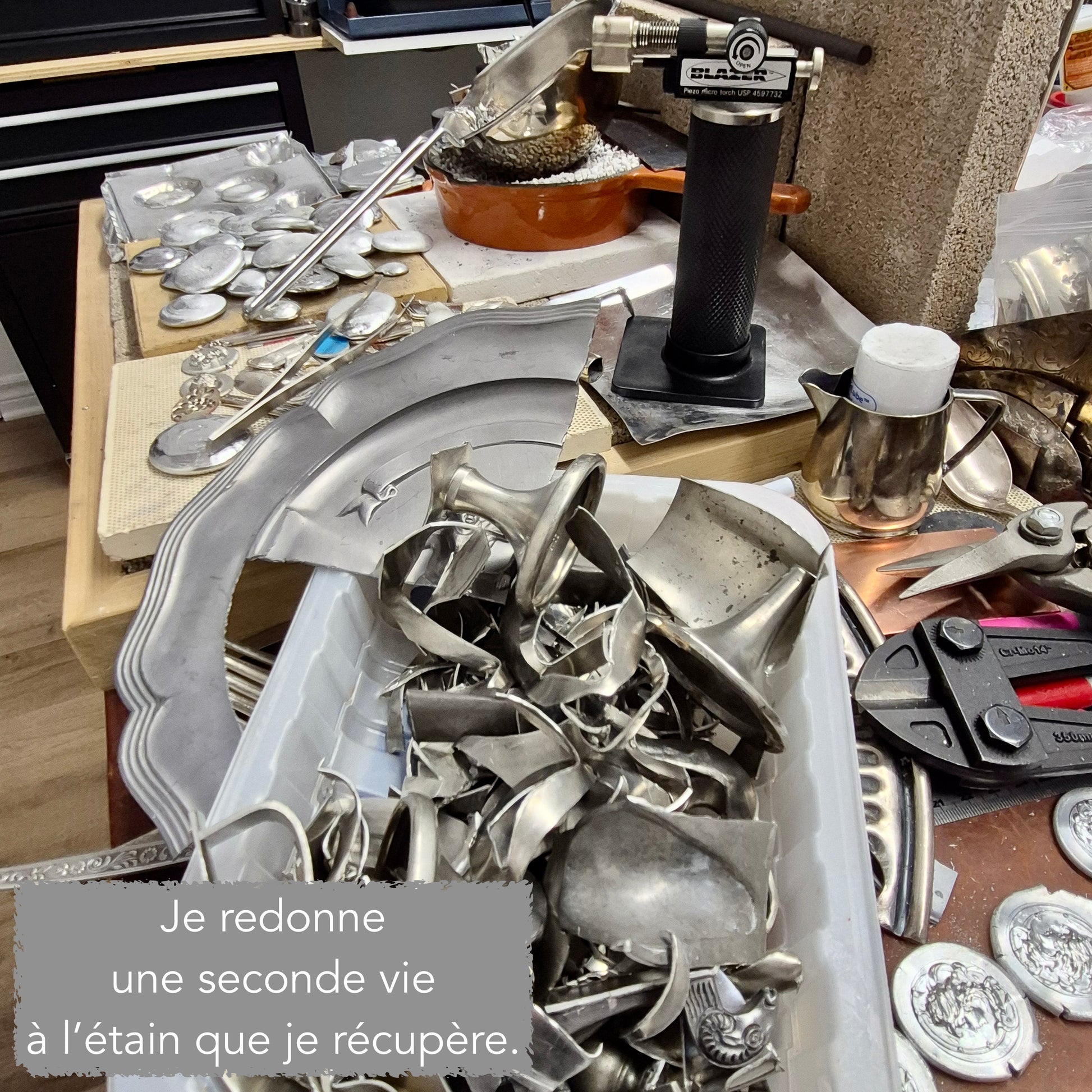 Je récupère d'anciennes pièces d'étain que je fais fondre en atelier.