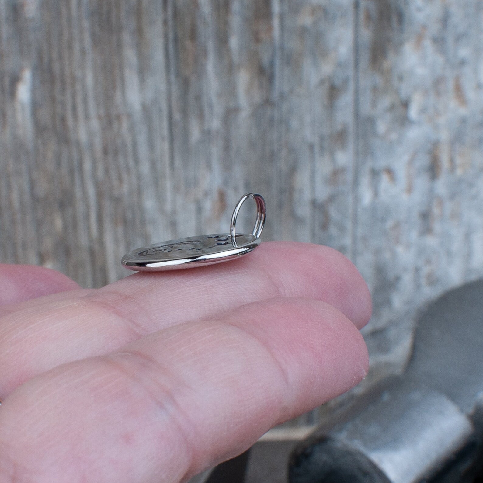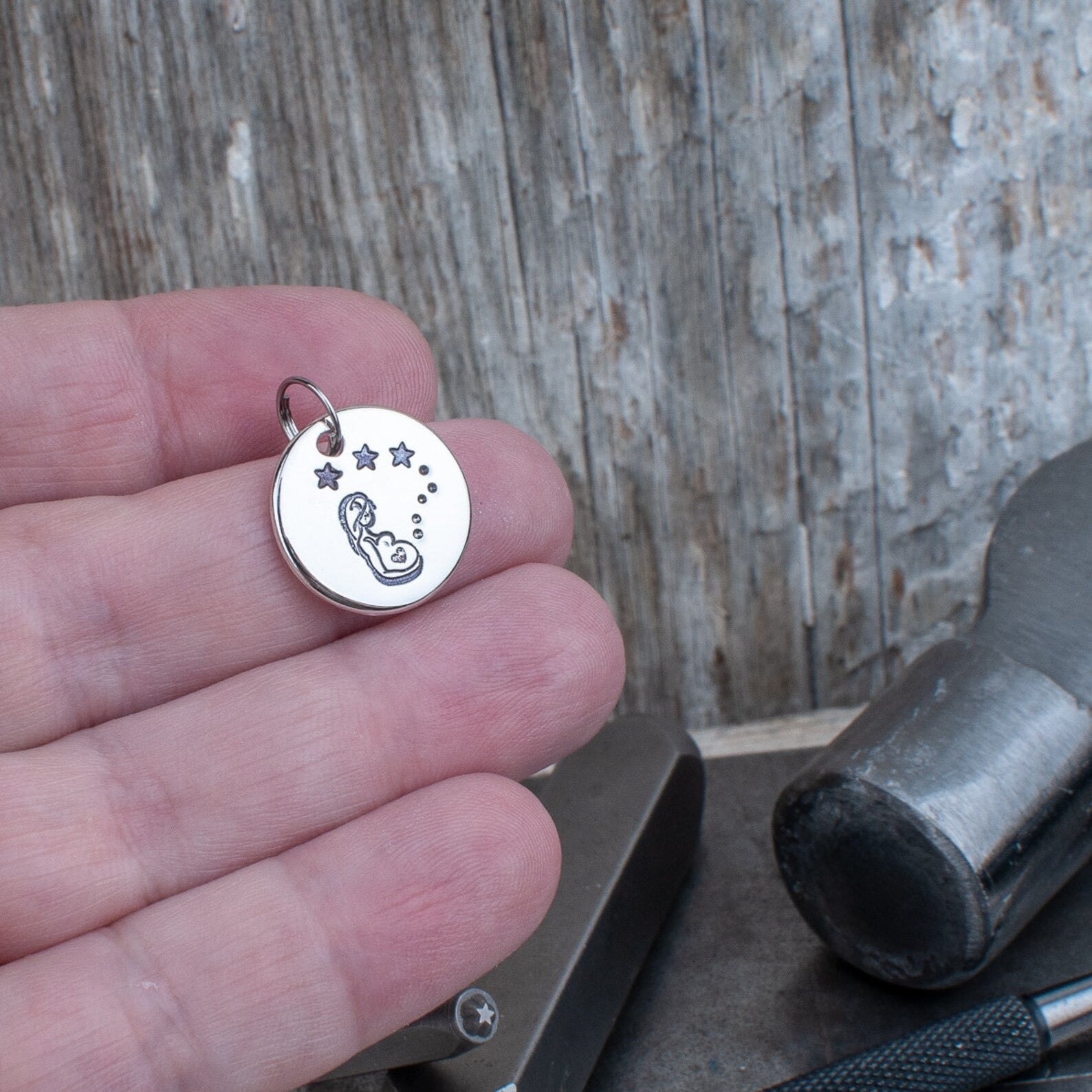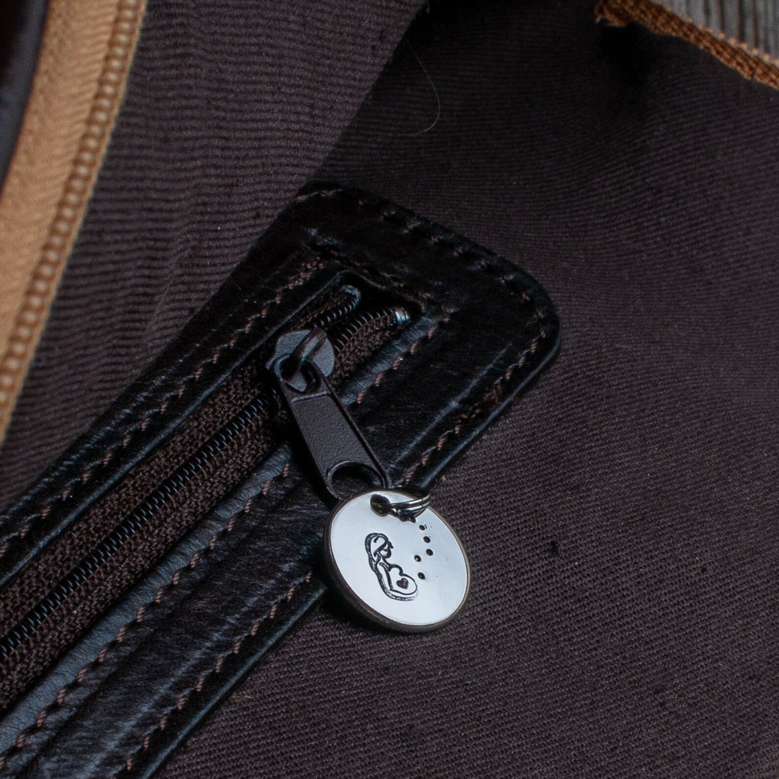 Cette médaille faite à la main est munie d'une anneau pour le mettre après une fermeture éclair. Sac à main, portefeuilles, peu importe où vous choisirez de le mettre, cette petite étoile vous suivra partout.